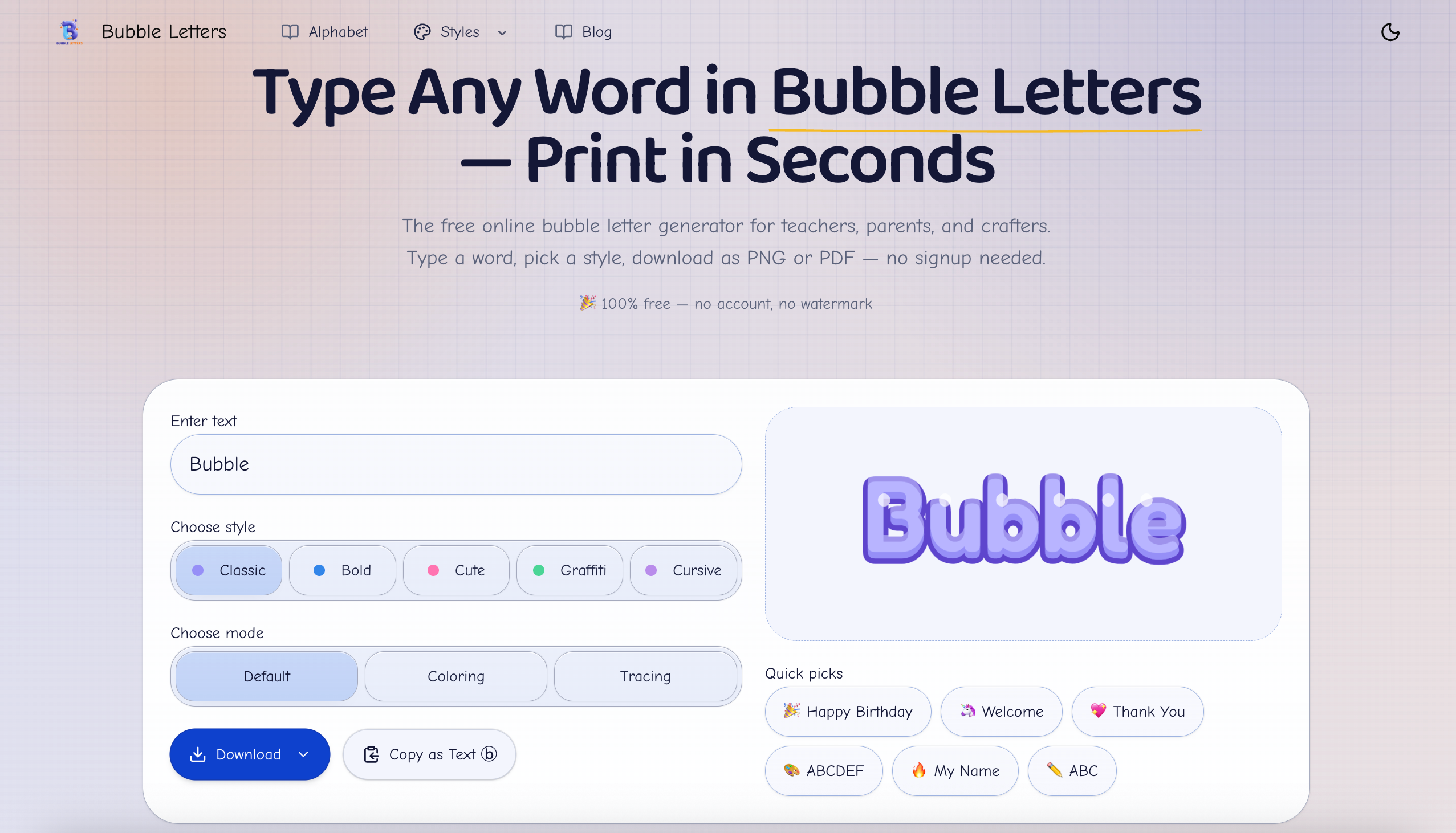 Bubble Letters是一款可将任意字符转换成气泡字的工具,适合儿童识字使用。